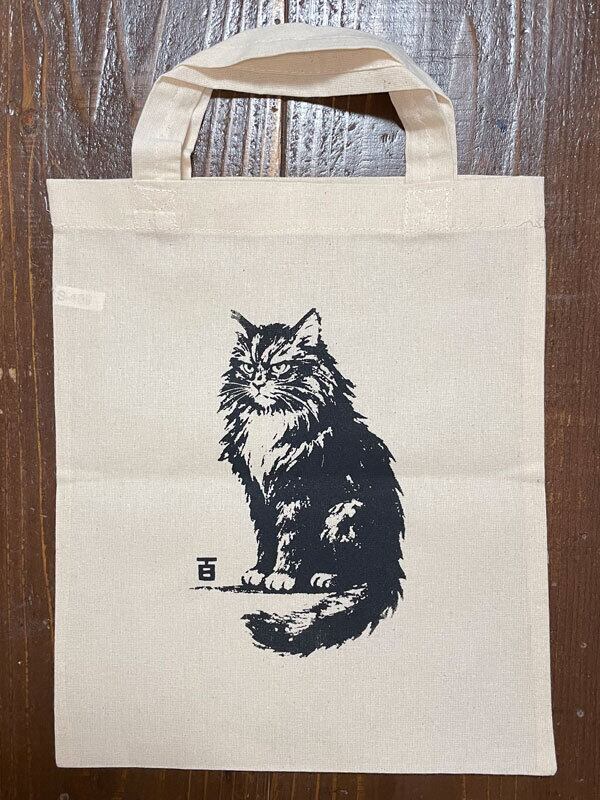 サイベリアンの百店長が渋い版画調でデザインされており、ユニークかつ個性的なスタイルを演出します。サイズ感はA4対応で、普段使いから特別なお出かけまで幅広く活躍します。