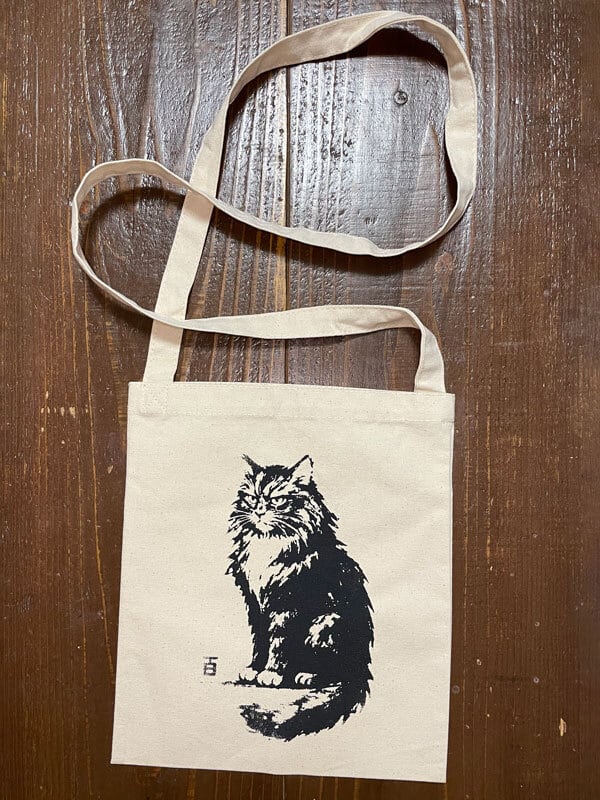 渋いサイベリアンの百の版画調デザインが施されており、ユニークかつ個性的なスタイルを演出します。サイズ感はA4対応で、普段使いから特別なお出かけまで幅広く活躍します。