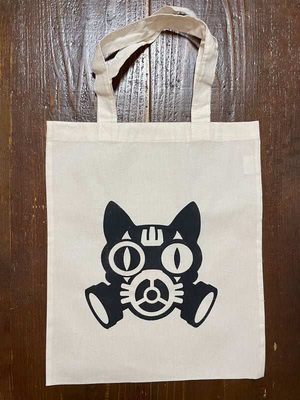 猫とガスマスクを合体してデザインした軽量感あふれるコットンバッグ4.7オンスです。持ち手が長いため、肩掛けでも手持ちでも快適に使用できる2WAY仕様が魅力的。薄手の生地ですが、しっかりとした作りで、日常使いからお買い物、旅行まで幅広く対応可能です。