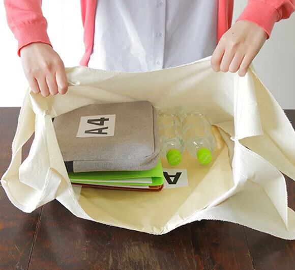 ナチュラルなコットン素材とLサイズの大きめなシルエットがざっくり感を醸し出し、尚且お買い物時には気軽に物を詰め込めるため使い勝手も良い、マルシェタイプのエコバッグです。